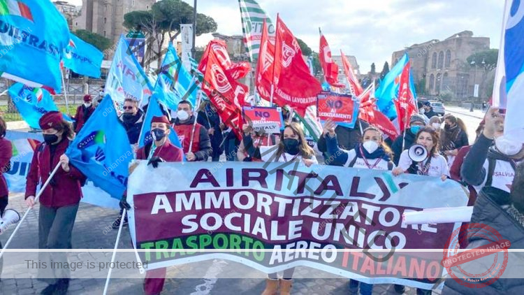 Si è svolta oggi a Roma una nuova manifestazione di protesta, contro i licenziamenti, da parte dei lavoratori di Air Italy con il coordinamento di tutte le organizzazioni sindacali. Il corteo, partito dal Colosseo ha percorso via dei Fori imperiali per raggiungere piazza SS Apostoli.