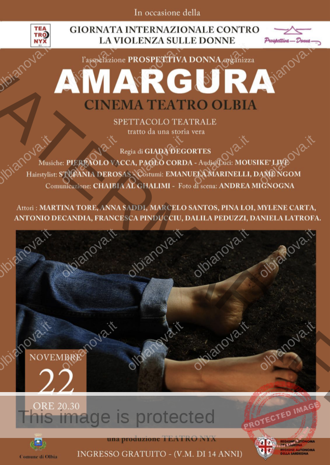 OLBIA. Andrà in scena venerdì 22 novembre, alle 20:30, al Cinema Olbia, “Amargura”, lo spettacolo della compagna Teatro Nyx scritto e diretto da Giada Degortes. L’evento è oorganizzato dall’associazione Prospettiva Donna e dalla presidente Patrizia Desole. L’ingresso è gratuito.