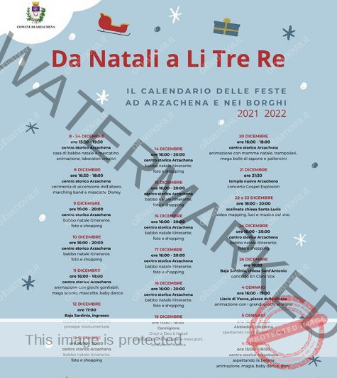 Arzachena festeggerà il Natale con un programma ricco di eventi a partire dall’8 dicembre con l’accensione dell’albero ecologico e l’apertura  del villaggio nel centro storico che ospiterà la casa di babbo natale, il mercatino, attività di animazione e laboratori creativi.