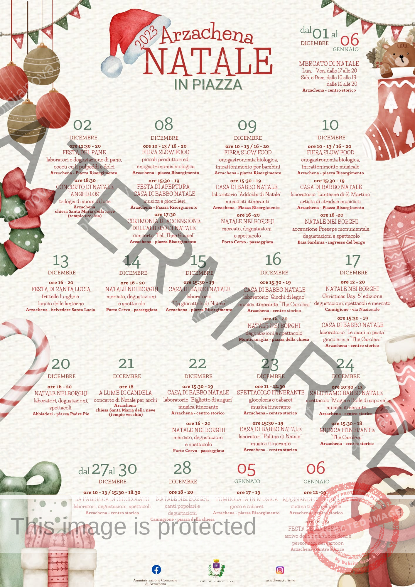 ARZACHENA. Prenderà il via il prossimo 1 dicembre il calendario di eventi natalizi del comune di Arzachena. Fino al 6 gennaio 2024 il centro storico sarà allestito a festa con il mercatino e il villaggio di Natale, che faranno da sfondo tutti i giorni al programma “Natale in piazza” messo a punto dall’amministrazione comunale grazie alla collaborazione tra l’Assessorato allo Sport e Spettacolo, delegata Nicoletta Orecchioni, l’Assessorato al Turismo e Commercio guidato da Claudia Giagoni, e quello alle Attività Produttive, delegata Stefania Fresu.
