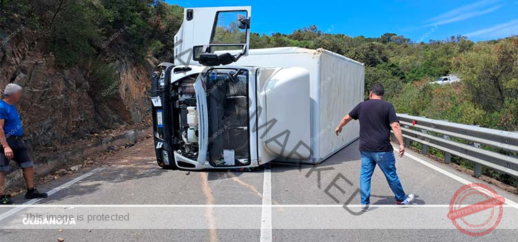 OLBIA. Un autoarticolato si è ribaltato andando a invadere la corsia opposta, forse per una collisione con la parete rocciosa in seguito a un guasto meccanico. È accaduto intorno alle 12:00 sulla Olbia-Arzachena, al chilometro 328, nei pressi di Sole Ruiu.