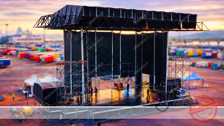 Il lavoro procede per fasi e coinvolge già un numero consistente di addetti. “Le persone impiegate qui – dice Balistreri – sono un centinaio, per il momento. Poi arriveranno i tecnici che devono montare tutte le attrezzature audio”. La tabella di marcia è serrata: “In questo momento stanno allestendo il palcoscenico e la struttura, e dovrebbero completare entro oggi anche le apparecchiature delle luci”.