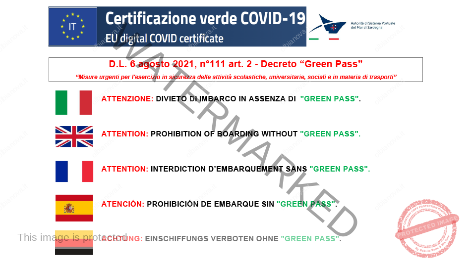 Le nuove regole, stabilite dall’articolo 9 del DL del 6 agosto, riguardano in modo particolare la Sardegna. L’Autorità di Sistema Portuale informa infatti che, dal 1° settembre, l’accesso sui traghetti in partenza dalla Sardegna sarà consentito esclusivamente ai passeggeri provvisti di green pass: “Gli imbarcanti sprovvisi di tale documentazione – scrive in un comunicato l’Autorità Portuale – e pertanto non ammessi a bordo delle navi in partenza, non potranno sostare nell’area portuale ad accesso ristretto”.