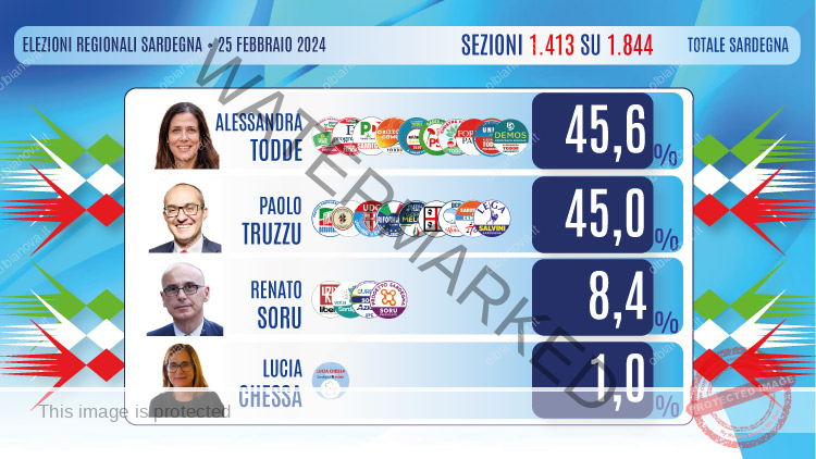 A Olbia, chiusi i seggi con lo spoglio di 54 sezioni su 54, Alessandra Todde ha raccolto 9.675 preferenze (41,68%) mentre Paolo Truzzu ha incassato 12.169 voti (52,42%), Renato Soru 1.214 (5,23%), Lucia Chessa 157 (0,68%).