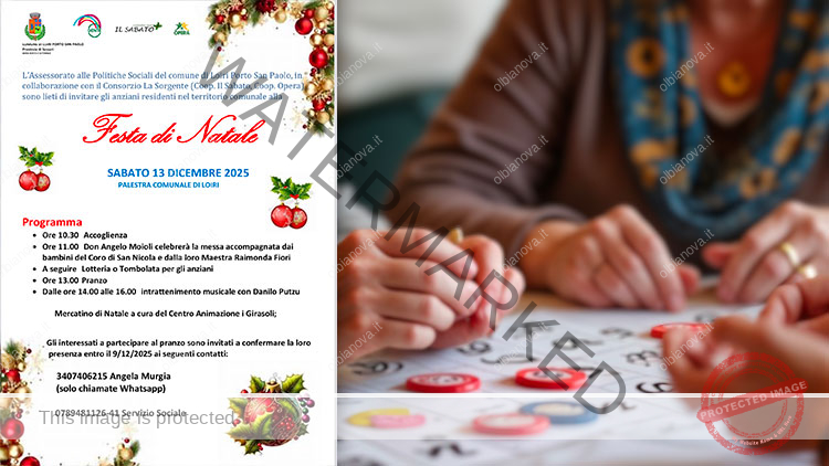 Loiri Porto San Paolo 7 dicembre 2025 – L’Assessorato alle Politiche Sociali organizza la Festa di Natale dedicata agli anziani del territorio. L’appuntamento è fissato per sabato 13 dicembre nella palestra comunale di Loiri, con un programma che unisce momenti religiosi, convivialità e intrattenimento.