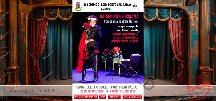 LOIRI PORTO SAN PAOLO. Mercoledì 20 novembre alle 9:30, presso la Casa delle Farfalle di Mare a Porto San Paolo, si terrà lo spettacolo teatrale “Barbablù e Rossana”, organizzato dall’Assessorato alle Politiche sociali giovanili del Comune, guidato da Francesca Asole, in vista del 25 novembre, Giornata internazionale per l’eliminazione della violenza contro le donne.