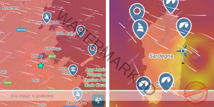 Per quanto la Gallura orientale sarà più al riparo rispetto alla costa ovest, i venti saranno comunque oltre i 20 nodi con raffiche superiori ai 40 kn.