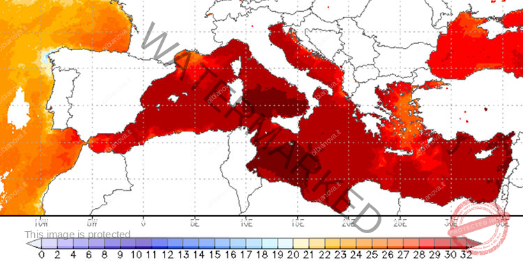 Le temperature del mar Mediterraneo hanno ormai raggiunto valori eccezionali, superiori ai 30 gradi anche in diversi settori del Tirreno meridionale. Le temperature minime notturne, sempre maggiori di 25 gradi, non permettono alle acque superficiali di cedere calore e mitigare il costante surriscaldamento diurno.
