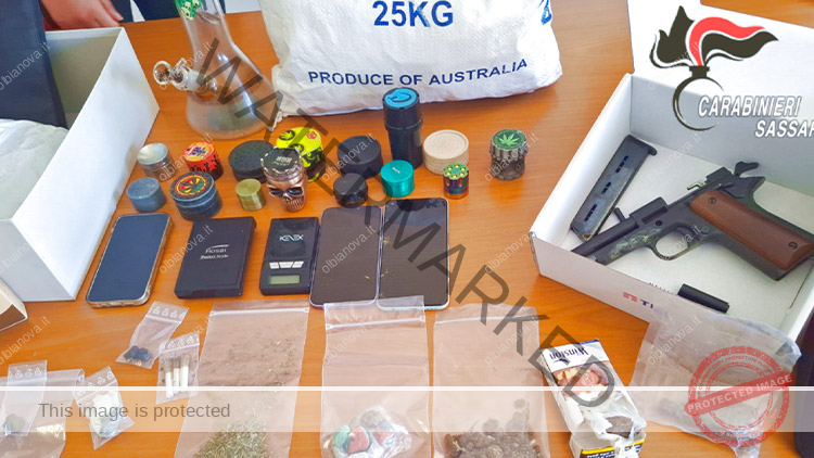 Sono stati sequestrati circa 415 grammi di marijuana, 82 grammi di hashish, sostanza da taglio, una pistola a salve priva di occlusione alla canna, capsule ingeribili, trituratori di infiorescenze, bilancini di precisione, sei smartphone, un computer portatile e altro materiale per il confezionamento delle dosi. Particolare attenzione è stata posta sulla pistola modificata, oggetto di ulteriori accertamenti, e sulle capsule ingeribili, usate per occultare la droga, pratica ritenuta pericolosa e inefficace.