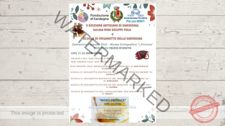 Affiancata a “Monti Produce”, la V edizione “Artigiani di Sardegna”. Protagonisti della manifestazione i mini gruppi folk e le scuole di organetto della Sardegna. La serata sarà allietata dal gruppo folk “San Paolo di Monti”. Dai mini gruppi folk “San Pietro” di Ittiri, “Messaieddas de Campidanu” di San Nicolò d’Arcidano.
