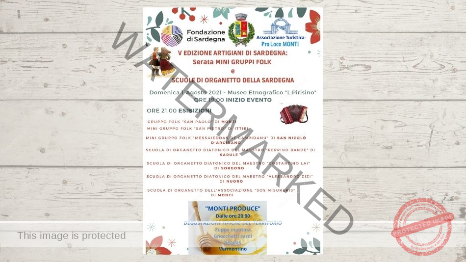 Affiancata a “Monti Produce”, la V edizione “Artigiani di Sardegna”. Protagonisti della manifestazione i mini gruppi folk e le scuole di organetto della Sardegna. La serata sarà allietata dal gruppo folk “San Paolo di Monti”. Dai mini gruppi folk “San Pietro” di Ittiri, “Messaieddas de Campidanu” di San Nicolò d’Arcidano.