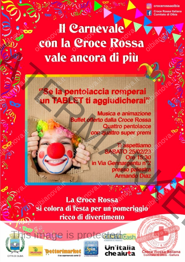 OLBIA. La sezione olbiese della Croce Rossa Italiana organizza la pentolaccia di carnevale per bambini. L’evento, patrocinato dal comune di Olbia, si terrà sabato 25 febbraio alle 15:30 nella palestra della scuola media Armando Diaz in via D’Annunzio 2.