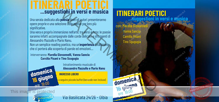 OLBIA. Marella Giovannelli, Vanna Sanciu, Camilla Pisani e Tino Scugugia sono i protagonisti di “Itinerari poetici”, la serata organizzata dalle associazioni Mediterrarte e Arché negli spazi di Su Entu Lab in via Basilicata 24/26, domenica 16 giugno alle 19:00.