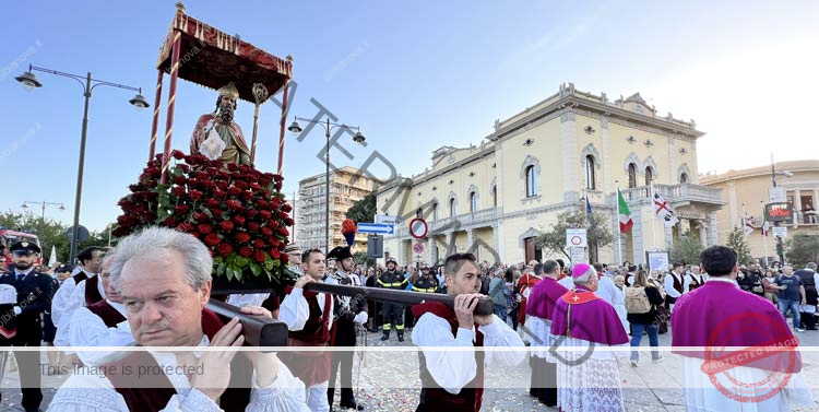 ★VIDEO★ OLBIA. Si sono conclusi tra due ali di folla che hanno accompagnato per tutto il percorso la processione religiosa i festeggiamenti in onore del santo patrono di Olbia il protovescovo dell’antica diocesi di Civita. La statua del santo alloggiata su una nuova, più grande portantina è stata portata a spalla da otto figuranti (non più quattro come avveniva nell’era pre-covid) del Gruppo Folk Olbiese.