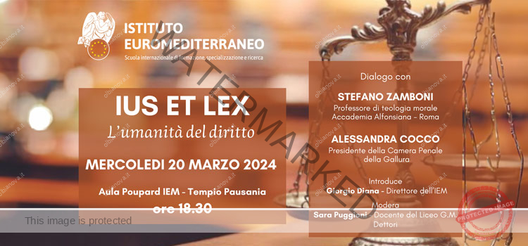Mercoledì 20 marzo 2024, alle ore 18.30, presso l’Istituto Euromediterraneo a Tempio Pausania, avrà luogo il convegno “Ius et lex: l’umanità del diritto”. L’evento, organizzato dall’IEM, riunirà i relatori: Alessandra Cocco, presidente della Camera Penale della Gallura e Stefano Zamboni, professore di Teologia Morale presso l’Accademia Alfonsiana di Roma.