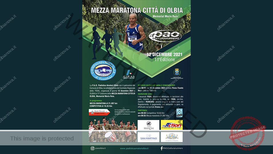 La P.A.O. Podistica Amatori Olbia con il patrocinio del Comune di Olbia e la collaborazione del Comitato Regionale della Fidal, organizza l’11a edizione della Mezza Maratona Città di Olbia, memorial Mario Ruiu: domenica 12 dicembre 2021.